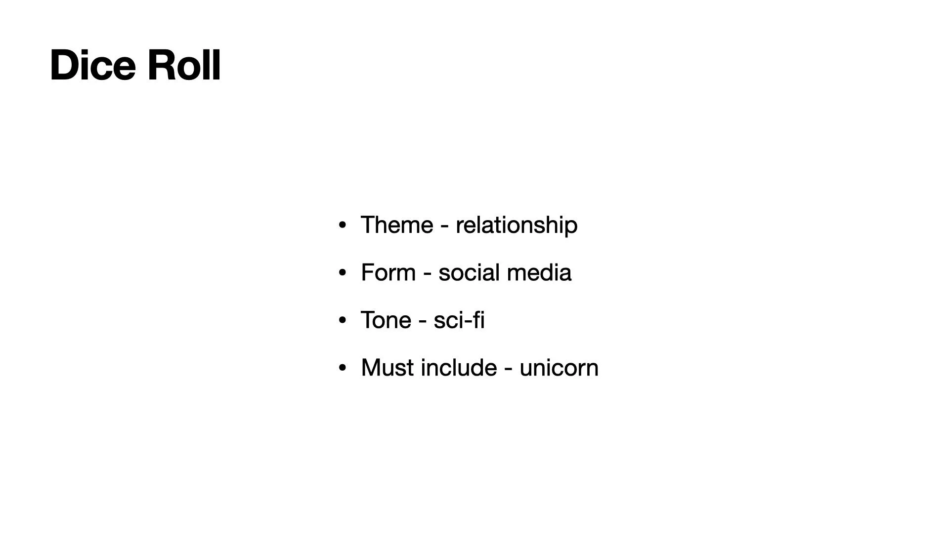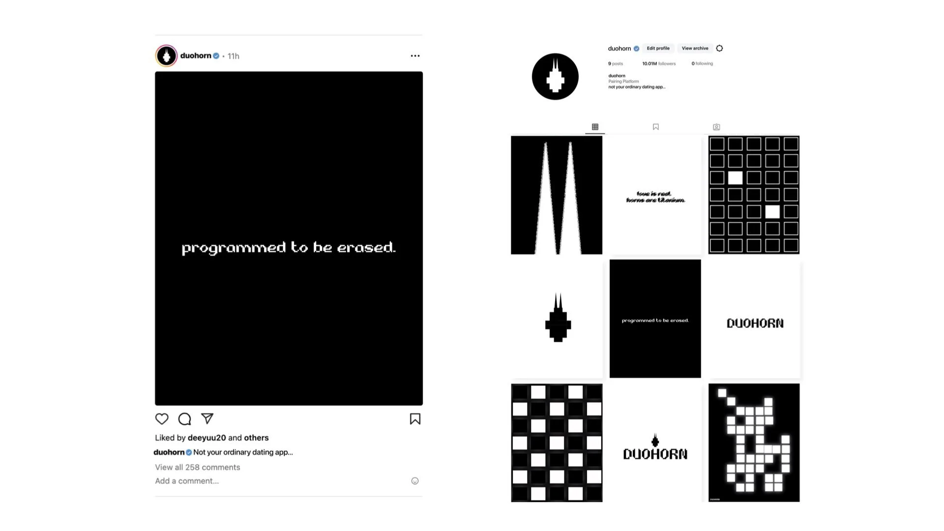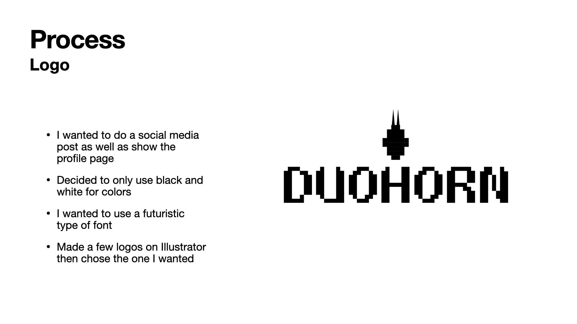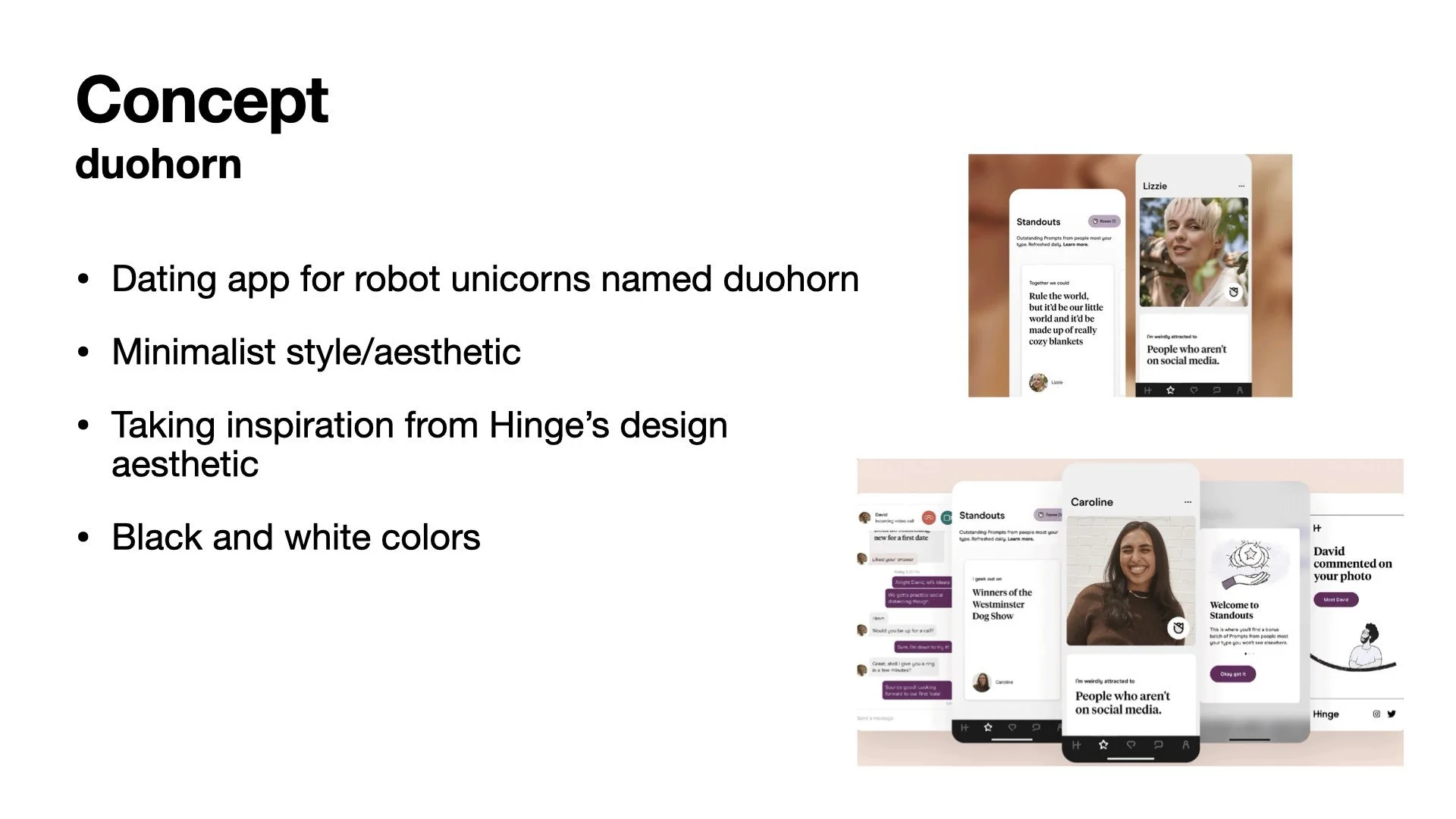 This project began with a dice prompt: roll for Theme, Form/Media, Tone, and Must Include. My results were Relationship, Social Media Post, Science Fiction, and a Unicorn. I came up with the idea to make a dating app for robot unicorns, while being influenced by Hinge’s aesthetic style. I only used black and white as the colors and I made a logo for this app. I made a singular Instagram post as well as a screenshot of the profile with nine posts in total.